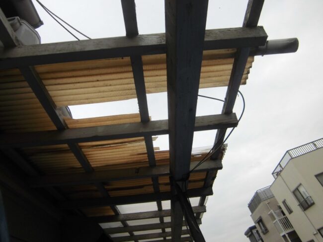 リフォーム部森です。 近隣のアパートで庇の波板が風にあおられて吹き飛んでしまったと言うことで張り替えの工事をする事になりました。 昨日剥がしてきたので写真の状態になりました。 今日はあいにく雨が降ってしまっ…