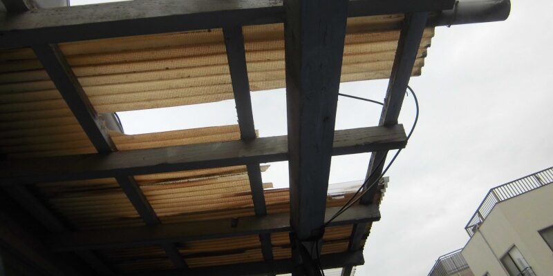 近隣のアパートで庇の波板が風にあおられて吹き飛んでしまったと言うことで張り替えの工事をする事になりました。