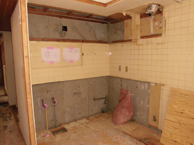 リフォーム部、森です。フルリフォーム物件の工事も快調に進んでおります。 キッチンの下地と家電収納を設置する壁の造作がおわりました。 元々L型のキッチンが付いていました。リフォームするにあたり対面式カウンターキッチンを採用…