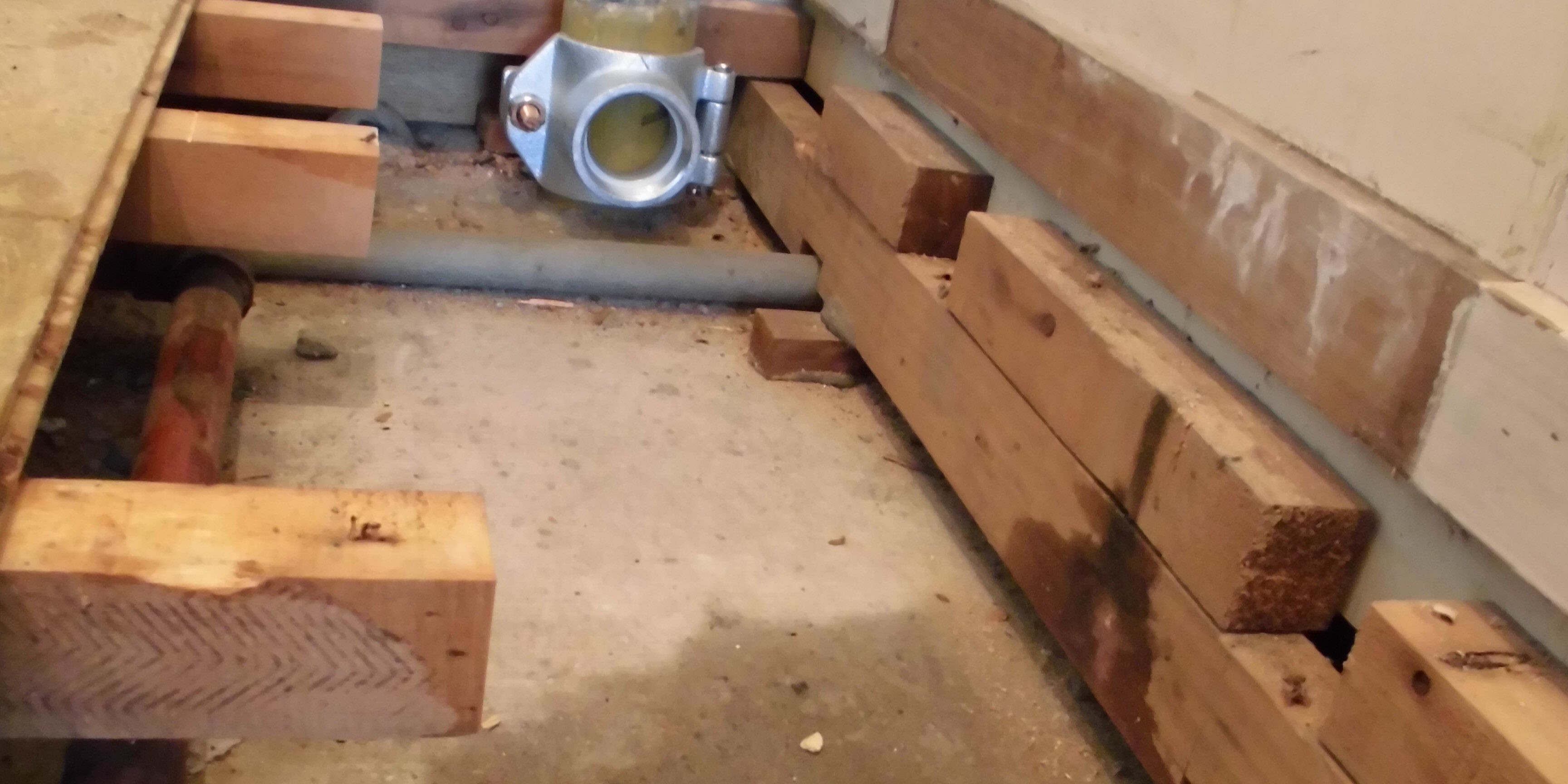 洗濯機置き場の無い団地ではホースを浴室に伸ばして排水しています。①床の上にホースを伸ばして使用しているので排水が飛び出しそうで不安、また②高齢になってきたためトイレに行くときホースに躓きそうで怖いという理由で床下配管で洗濯機パンに接続する工事をご希望されました。