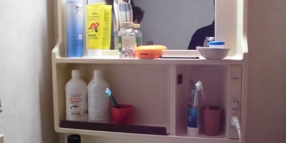 60㎝の洗面化粧台下のスペースに温水器を入れるので余計に場所をとることもありません。配管などもあり中は少しゴチャゴチャしますが扉を閉めれば全くわかりません。