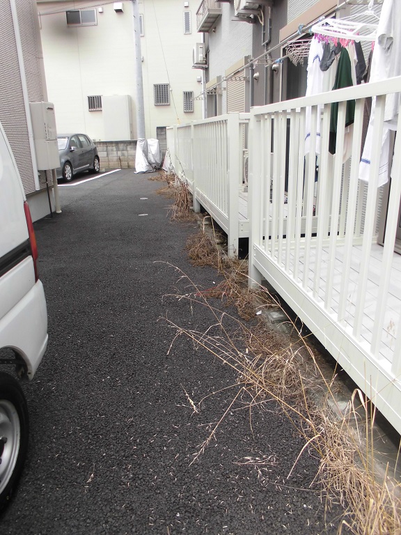 リフォーム部の森です。 今日は久しぶりの雨が降らない予定だったので管理物件の雑草取りを行いました。 2週間前位にラウンドアップマックスロードという除草剤を全体に噴霧したので草取り前の写真の雑草もほとんど枯れています。 駐…
